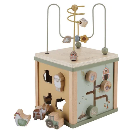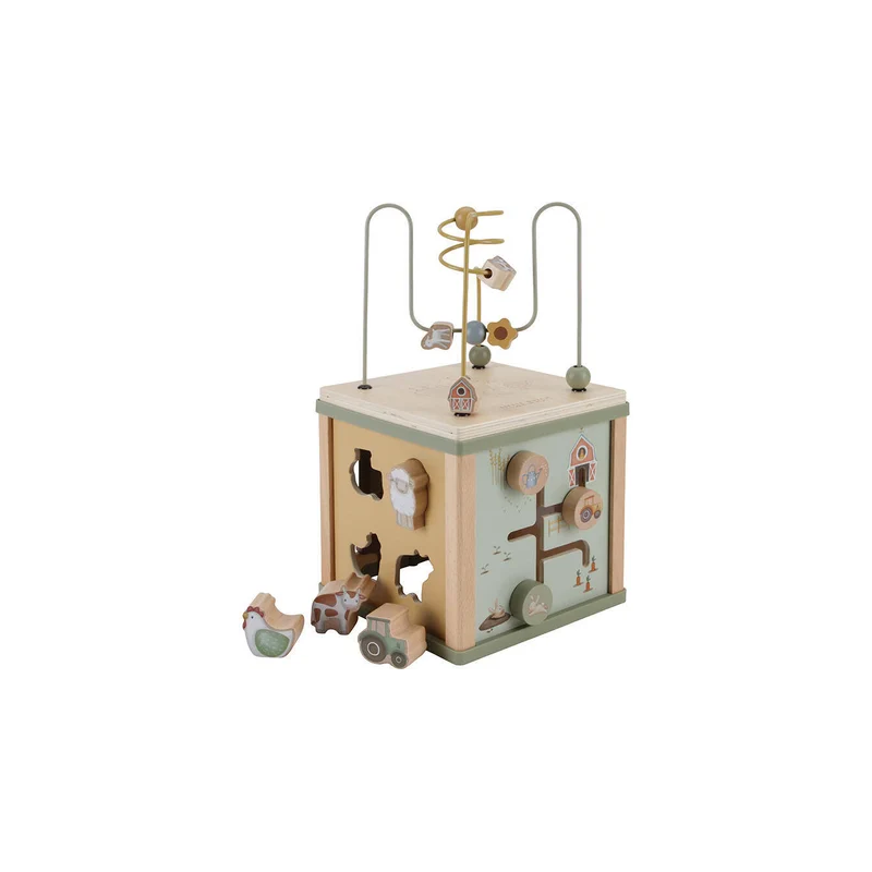 Ce cube d'activités en bois offre de nombreux défis à votre enfant. Chaque face est illustrée avec les amis que vous trouvez à la ferme et propose une activité éducative telle qu'un trieur de formes, des engrenages qui tournent, des puzzles et une spirale de perles amusante sur le dessus. À chaque activité, les enfants développent leur motricité fine et sont encouragés à faire preuve de créativité.